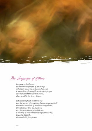 The title of the opening part, “You Call to Me from Dreams” is framed between reeds emerging from a pond and their reflection below, anticipating later images of the Jewish cemetery. The poem “Voice of a Sweet River” presents a scene that seems to be glimpsed from underwater, looking up. “Your Soul, Light as a Feather” is illustrated with Shats’ picture of a tree with two parallel branches, given visual form to the poet’s observation, “Now I am here to safeguard your soul, to entwine it with mine.” In a similar vein, “Your Hands in Mine” presents us with gnarled tree roots that evoke intertwined hands: “I see the fleeting reflection of your hands in mine.”