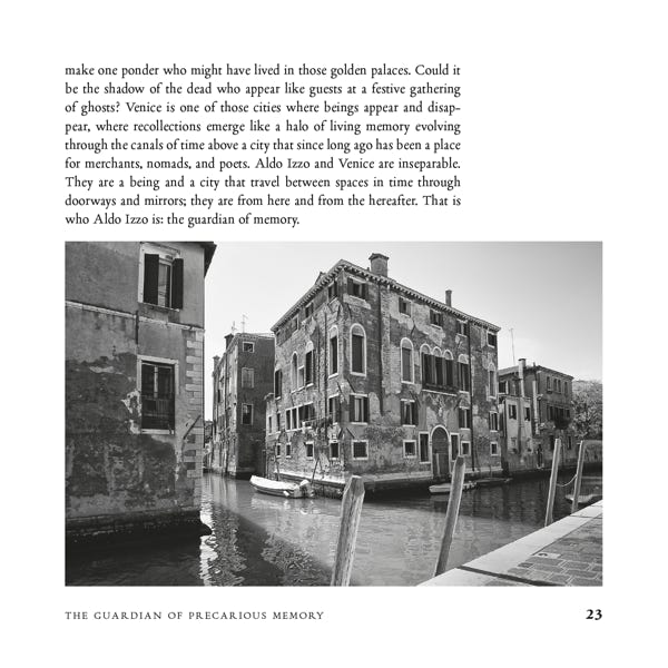 The Guardian of Memory chronicles the meetings between the author and Aldo Izzo, the eponymous “Guardian of Memory,” a man who has tended the Venetian Jewish cemeteries for over 30 years. However, this work goes far beyond a mere homage to Aldo Izzo’s tireless work and becomes a sensory journey through the ancient city of Venice that is interleaved with memories and stories of those who have gone before.