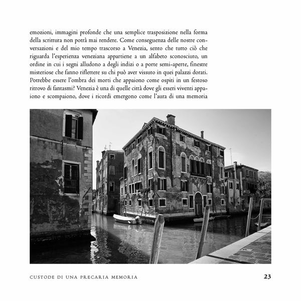 Con il sensibile apporto delle sue fotografie, Samuel Shats porta il lettore dentro a Venezia, alla sua luce e alle sue ombre, al mare sul quale è costruita, ma soprattutto dentro al rapporto tra Marjorie Agosín e Aldo Izzo. Il cimitero ebraico getta la sua aura. Il custode della memoria ha lasciato questa lettrice a cercare attentamente dentro al suo cuore i ricordi che lei stessa conserva e che vuole conservare.